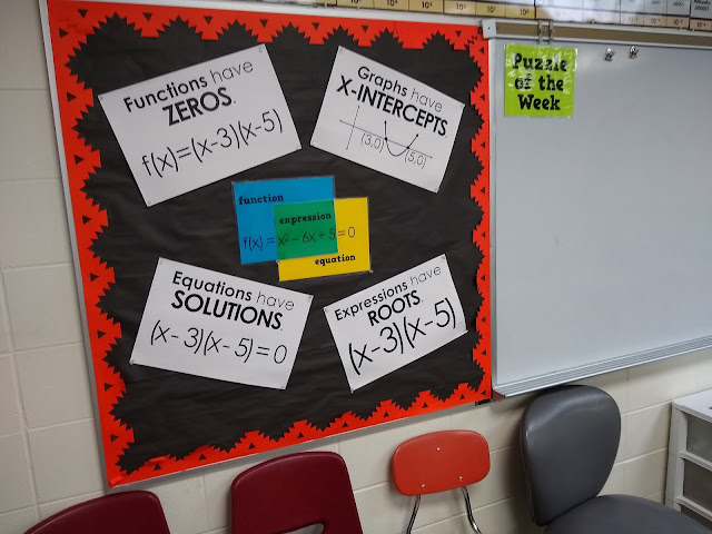 My one and only bulletin board in my classroom features my Zeros/Intercepts/Solutions/Roots posters and my Function/Expression/Equation poster. I think these work together really well.